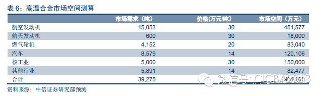 此外,假設航(hang)空發動機、航(hang)天、燃氣輪(lun)機、汽車、核(he)工業占高溫(wen)合金總(zong)需求的85%,則其他(ta)行業每年對高溫合金需求約為5900噸。