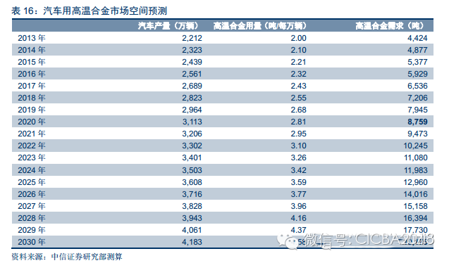 我們假設2013年每(mei)萬輛汽車高溫合金2噸,今后20年(nian)每年(nian)復合增長(chang)5%;到2020年汽車產量(liang)復(fu)合增速5%,2020年-2030年汽車(che)產量復合增速3%。依(yi)據測算(suan),2020年汽車用高溫合金需求為(wei)8715噸,2030年為1.9萬噸。