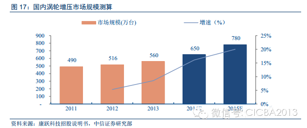 國內渦(wo)輪增壓器(qi)(qi)配(pei)置(zhi)率將持(chi)續提升,尤(you)其是汽(qi)油機渦(wo)輪增壓器(qi)(qi)配(pei)置(zhi)率提升空間巨大。面對與日俱增的環保和能源壓力,內燃機節能減排是(shi)大勢所趨。渦輪增壓是(shi)內燃機節能減排的有(you)效手段,其中汽油機節油效果5-10%,柴油機節(jie)油效果(guo)10-20%左右(you)。2012年我國內(nei)燃機渦輪(lun)增壓器綜合配(pei)置率為6.7%;其中車用柴油(you)機(ji)配(pei)置率(lv)為(wei)62%,未來的增長點主要來自于輕卡裝配(pei)率(lv)提升;而車用汽油機配(pei)置(zhi)率(lv)僅5%左(zuo)右,未來提升空間(jian)巨(ju)大。